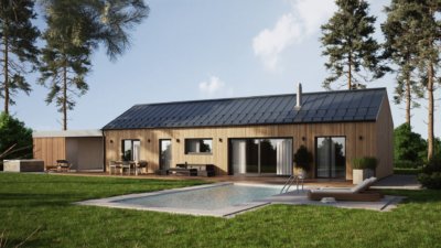 Bungalov pro ty, kteří hledají pohodlí a prostor. Moderní dispozice domu se středovým obývacím pokojem s výhledem do zahrady, který odděluje ložnici se soukromou koupelnou od dětských pokojů. Součástí domu je i zastřešené garážové stání a praktická kůlna.