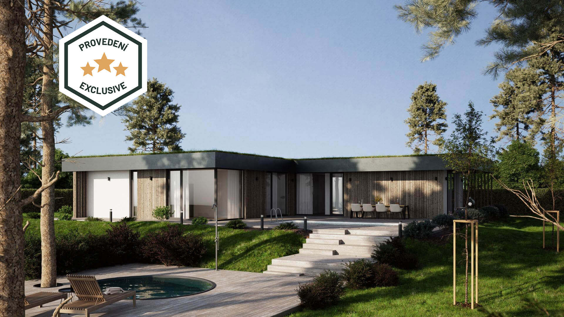 Nadčasové provedení s progresivní dispozicí. Exkluzivní bungalov do tvaru L s vlastní garáží zahrnuje 3 prostorné ložnice se soukromými šatnami, obývací pokoj volně přestupující v terasu.